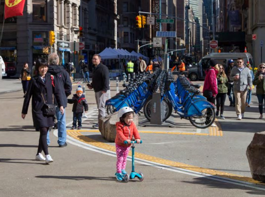The Partnership has collaborated with the NYC Department of Transportation (DOT) and local stakeholders on the initial projects of the agency’s signature Broadway Vision program by taking a block-by-block survey and study approach that culminated in a new “slow street” from 23rd Street to 21st Street, and a resurfaced and expanded plaza next to the Flatiron Building. Thanks to newly marked bike lanes and narrower space for vehicles on these blocks, traffic will be calmed, and people walking and biking will have more space.