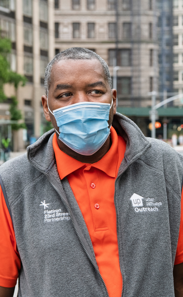 Hilton Douglas, Urban Pathways’ long-time Flatiron Housing & Outreach Specialist, helped hundreds of people secure safe, comfortable homes before retiring in December 2020. His compassion and empathy for those in Flatiron and NoMad set the foundation for effective, caring outreach services in the expanded district with both Urban Pathways and the City’s Department of Homeless Services.